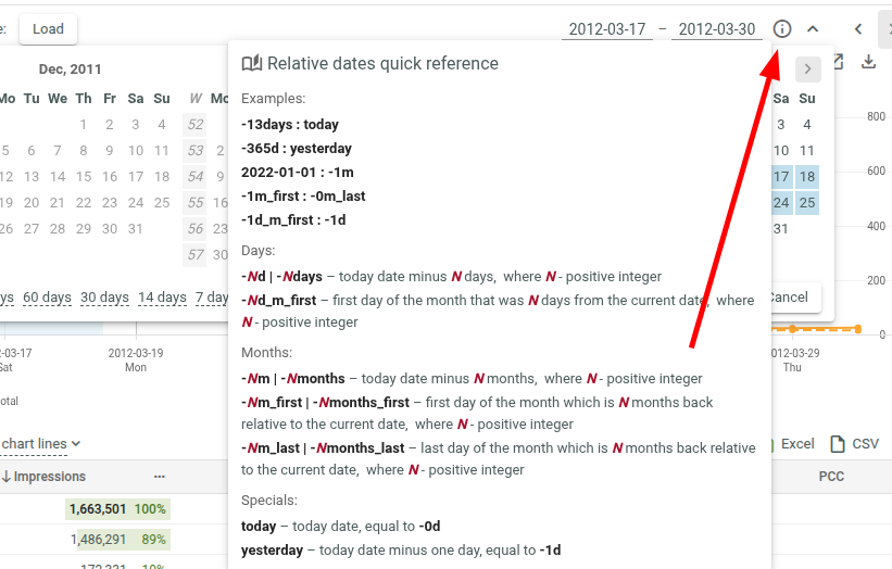 Relative dates can be used instead of fixed dates. In the above example, the request retrieves data from 7 days ago up to yesterday.